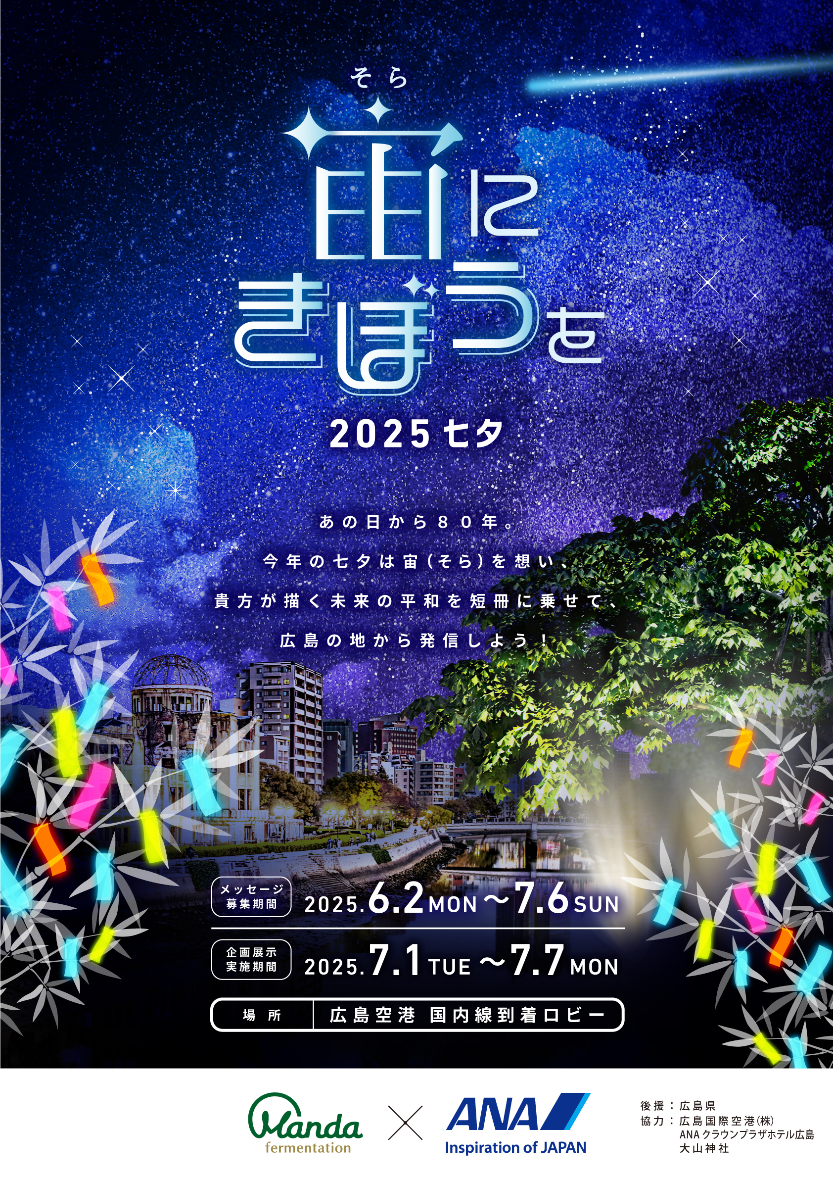 【万田発酵×ANA×広島空港】 宇宙と七夕がテーマの特別イベント 「宙(そら)にきぼうを」in広島空港を開催‼ 戦後80年の節目を迎えるこの夏 平和への願いを #広島 から#空(そら) に発信しませんか? 皆様の心の中にある「平和への願い」を 代筆して短冊に託し、広島空港の七夕飾りに飾らせていただきます。 詳細は 【公式】万田発酵 広報(Instagram) をご覧ください。