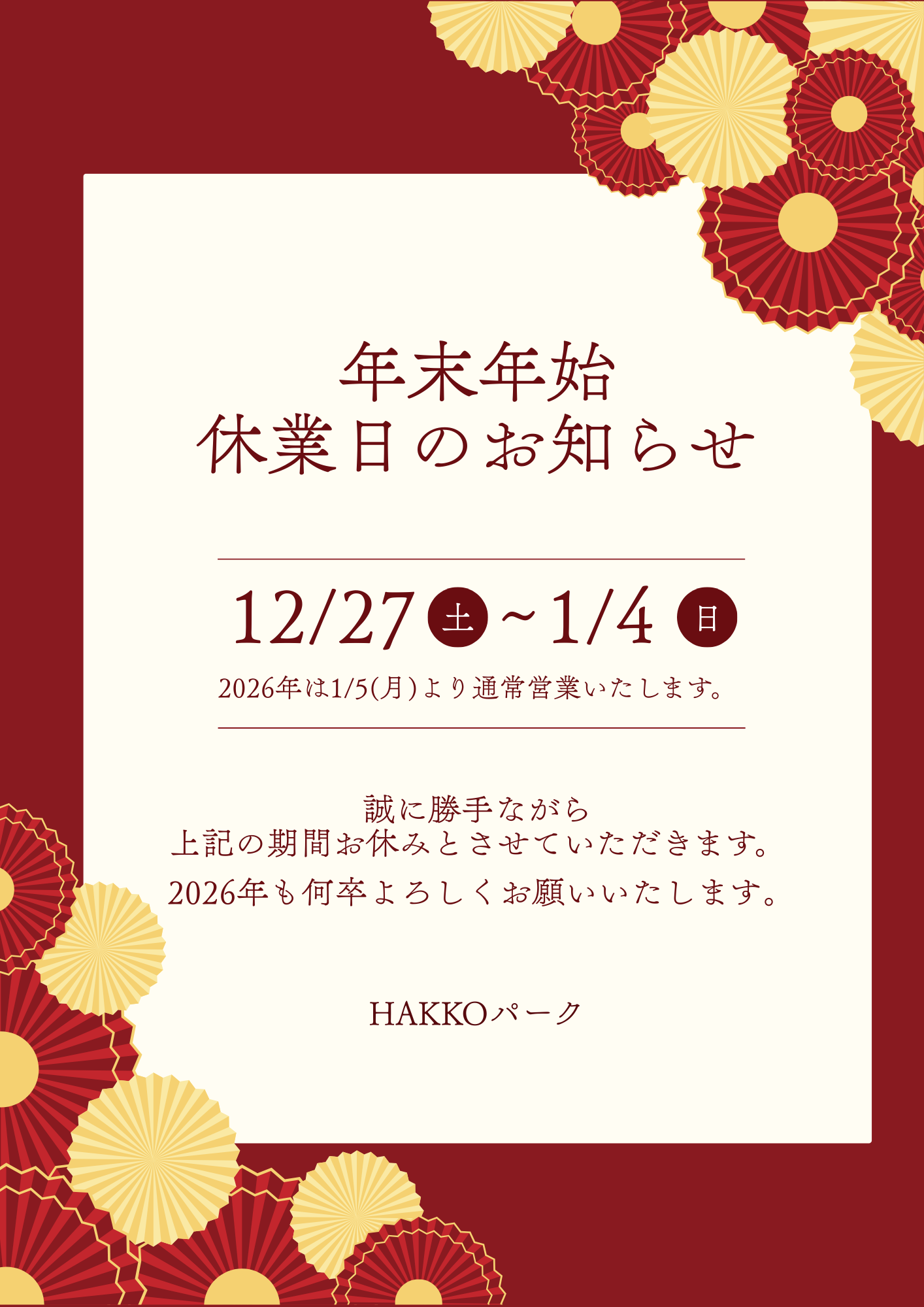 年末年始の休業期間を以下の通りとさせていただきます。
