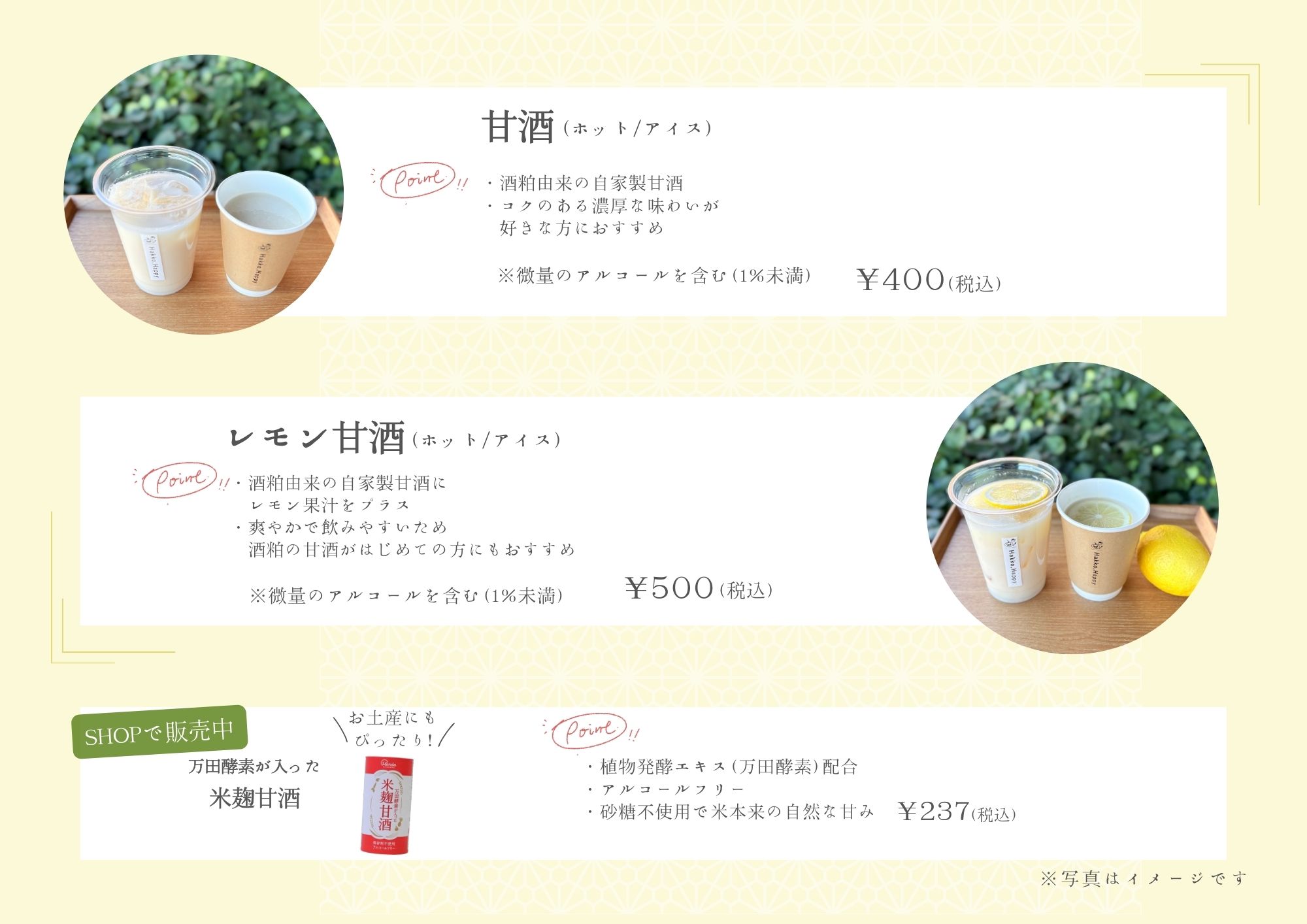 HAKKOゲートCaféにて新ドリンクが登場‼ 販売開始は2026年1月5日(月)から! 酒粕由来の自家製甘酒はホットとアイスをご用意しております。 ご来場の際はぜひご賞味ください。